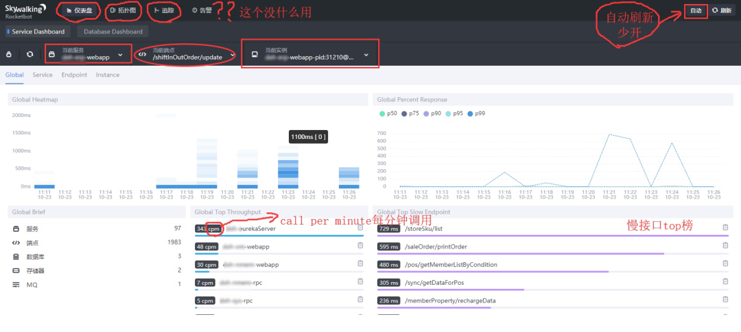 访问一些服务的链接,打开Skywalking的UI,即可看到下图的界面。我们可以从图中找到响应比较慢QPS又比较高的的接口,进行专项优化。