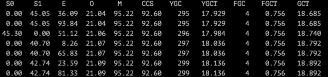 使用 jstat -gcutil pid 1000 每隔一秒打印一次 gc 统计信息。