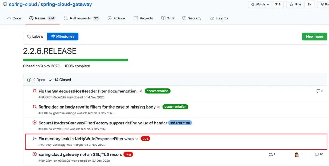 在 issue 中开发人员也给出了回应,确实是 SpringCloudGateway 的 BUG!此问题已在 2.2.6.RELEASE 版本中修复。而我们项目中使用版本为 2.2.3.RELEASE,所以就会出现这个问题。