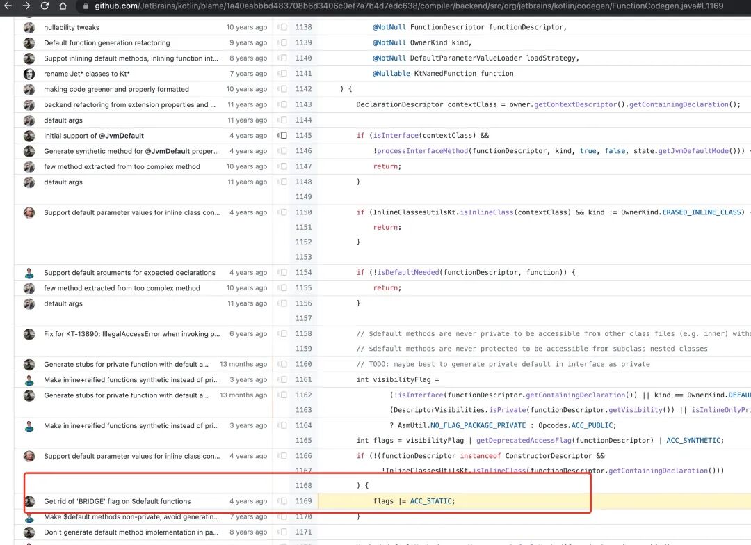 有了实验的结果,反过来寻找原因就很简单了,找到 kotlin 1.2 的源码,然后翻一翻源码,马上找到了对应的逻辑。在 4 年前的一个 commit 中,有一个伙计干掉了 ACC_BRIDGE 标记。