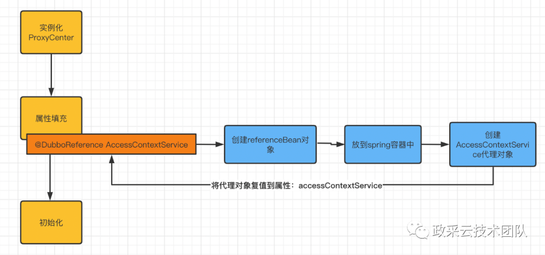 在我们项目中又有一个类:ProxyCenter ,它里面用 @DubboReference 定义了 accessContextService 。代码如下