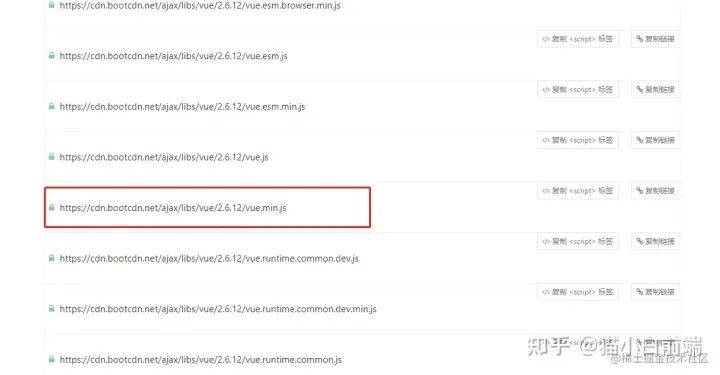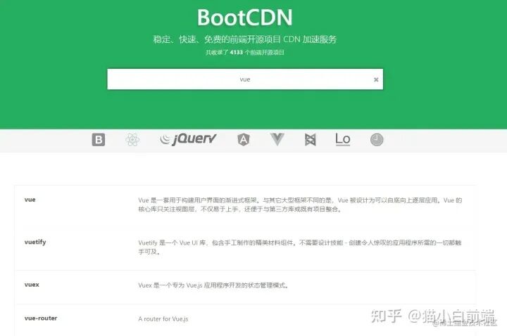 这里推荐一个免费的cdn: BootCDN。也可以使用自己购买的付费cdn服务,我们到网站搜索自己项目需要的js。例如:vue
