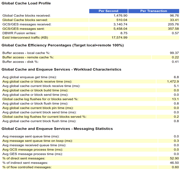 可以看到每秒传输的block以及message都不多,流量也并不大,所以完全没有必要去查看SQL ordered by Cluster Wait Time部分,继续往下看发现Avg global cache cr block receive time (ms)过高,达到了1473ms。判断此次大量的cluster等待是由于接受远端实例发送cr block过慢导致。