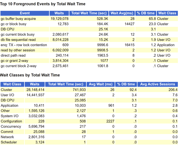 可以看到大量的wait class为Cluster的session,top event也看到大量的gc buffer busy acquire等待事件,该等待事件非常常见就不单独解释了,粗略计算cluster等待事件占据了dbtime的90%左右。