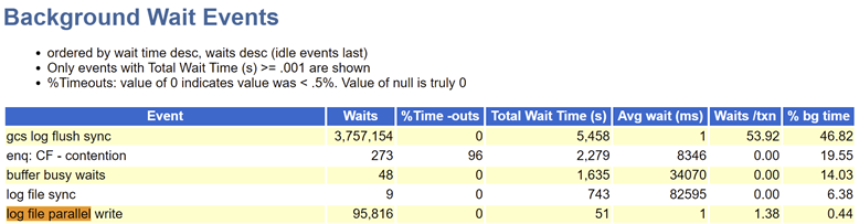 所以下一步思路是直接去看看2节点AWR的Background Wait Events和Wait Event Histogram查看LGWR的写性能如何,是否稳定。