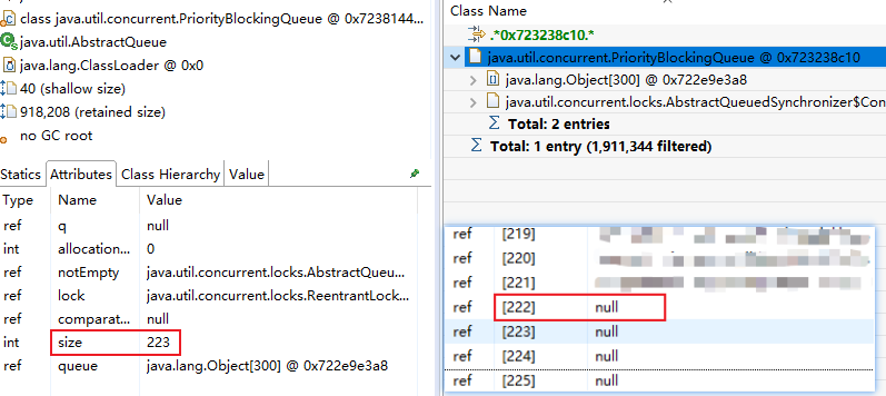 在某个业务服务中使用PriorityBlockingQueue实现按照优先级处理任务,某一天环境中的服务突然间不处理任务了,查看后台日志,发现一直抛出NullPointerException。将进程堆dump出来,使用MAT发现某个PriorityBlockingQueue中的size值比实际元素个数多1个(入队时已经对任务进行非空校验)。