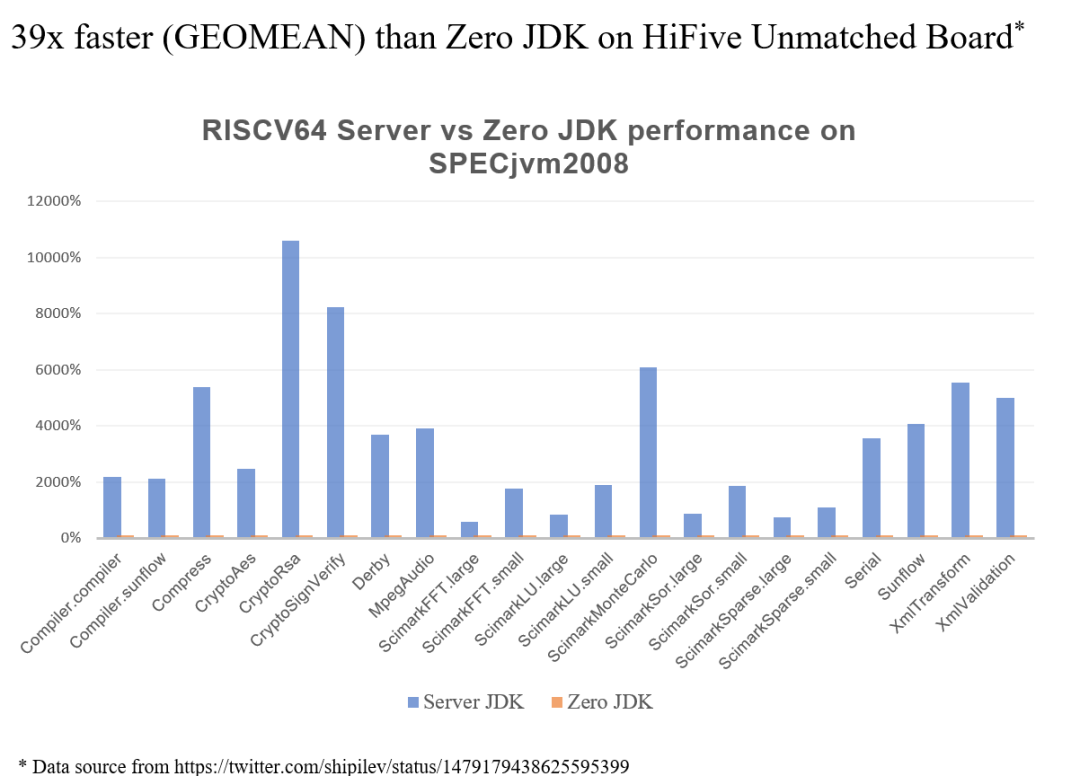 RISC-V port 实现了 C1/C2 JIT 编译器,相比 Zero 版本有较大的性能提升。下图对比了 RISC-V Server 和 RISC-V Zero 在 SPECjvm2008 上的性能差异,结果显示 RISC-V Server 性能可以达到 Zero 的 39 倍 [9]。