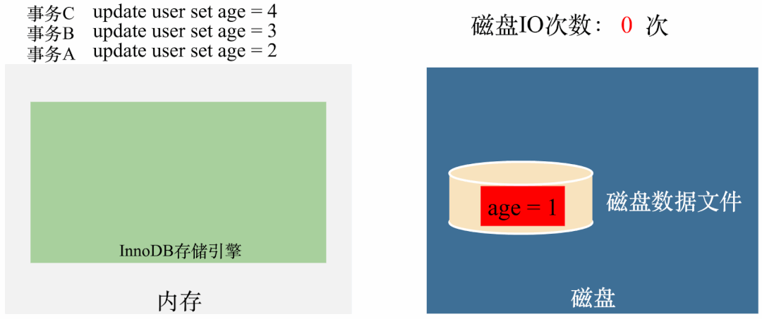 从图上可以看出,每次更新都需要从磁盘拿数据(1次IO),修改完了需要刷到磁盘(1次IO),也就是每次更新都需要2次磁盘IO。三次更新需要6次磁盘IO。