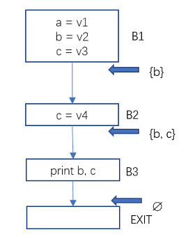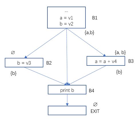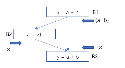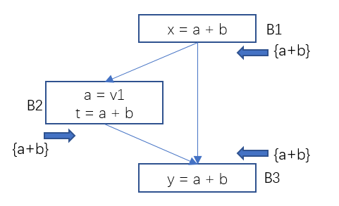 B2对a重新进行了赋值,但又生成了表达式a + b, 所以在B3的入口处 。此处B3中的表达式可以使用