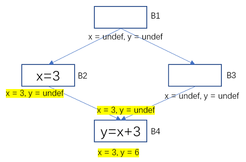 例如下面的一个流图,**标记表示因为程序语句的影响而发生变化的变量状态。变量x在基本块B2中的值是3, 在B3中的值是undef, 他们汇合后(最大下界)是常数3。在B4中,x是常数3, x + 3 就是常数6,所以B4中的指令就可以优化为 y = 6了。