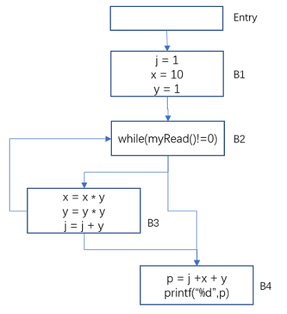 控制流图 (Control Flow Graph) 控制流图的节点是基本块,边代表基本块之间的跳转。基本块A到基本块B有一条边,表示基本块A的最后一条指令是一个跳转指令,跳转到了基本块B的第一条指令;或者基本块A的最后一条指令执行完可以顺序的走向基本块B的第一条指令。