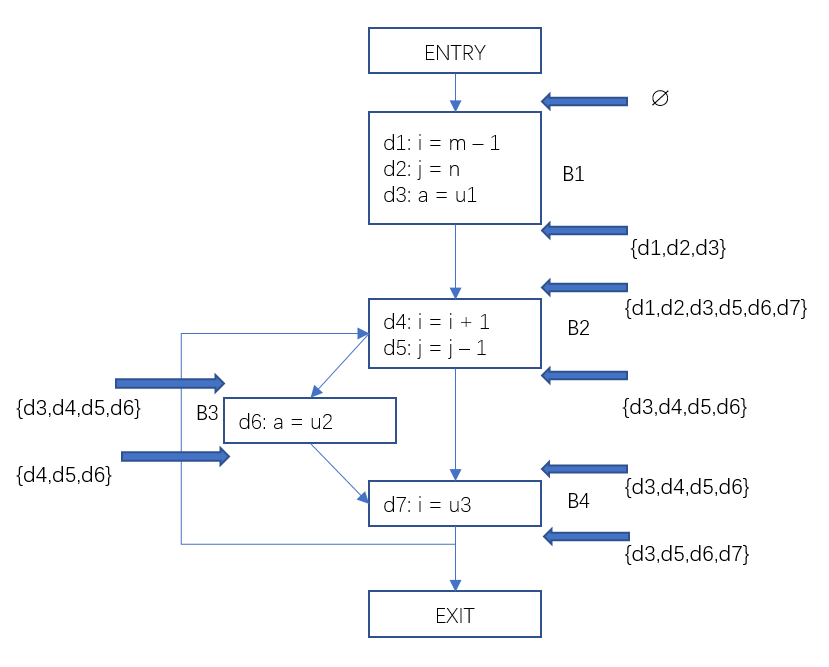 对于上面的控制流图,B2前驱节点包括B1和B2自身。B2的输入状态需要汇合B1结束后的状态OUT[B1] 和 B2结束后的状态OUT[B2], 如何汇合呢?这取决于我们的分析目的,对于到达定值分析,我们要汇集所有路径上过来的定值集合,所以对前驱节点的输出做并集运算OUT[B1]∪OUT[B2];而对于可用表达式分析,只有每一条通往此基本块的路径上都有这个表达式的生成时我们才说这个表达式在此基本块上是可用的,所以交汇运算是求交集OUT[B1]∩OUT[B2]。交汇运算用符号∧表示。