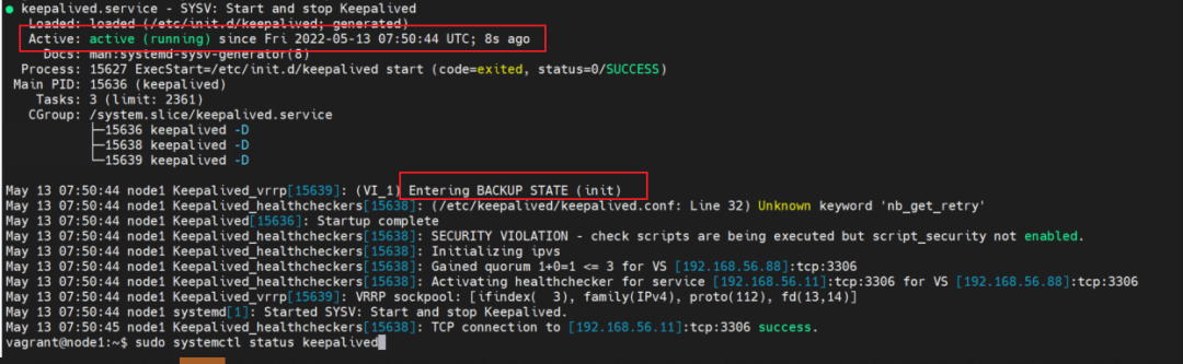 再次查看 node1 上 keepalived 上的状态,再发送信息给