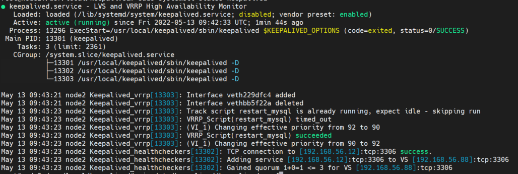 查看 keepalived 状态,执行 restart_mysql 成功