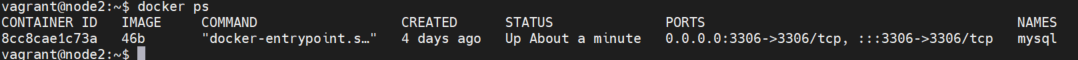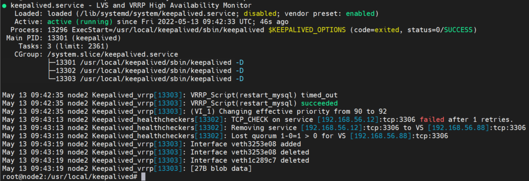 可以看到连接的是 node2 的容器的 id,说明 keepalived 已经通过虚拟 ip 连接到 node2 的 mysql 了,是正常工作的,node2 现在是作为主节点,node1 作为备用节点。
