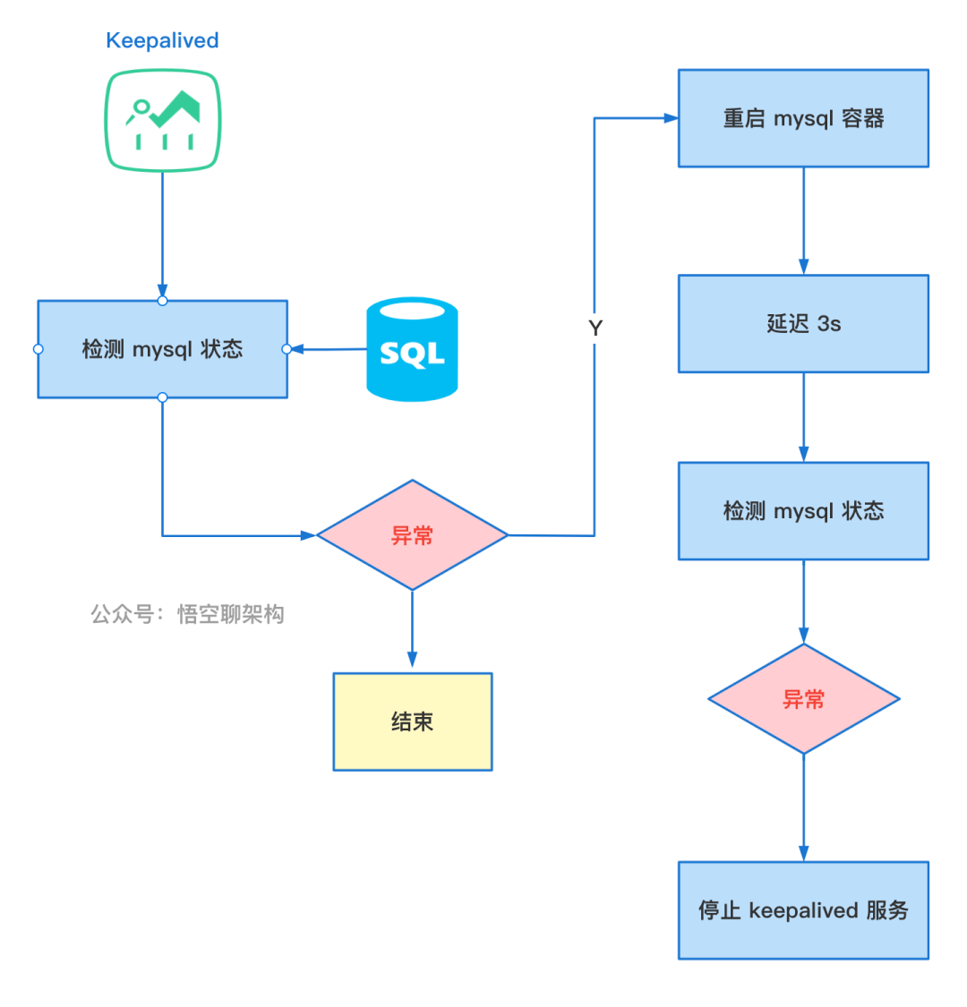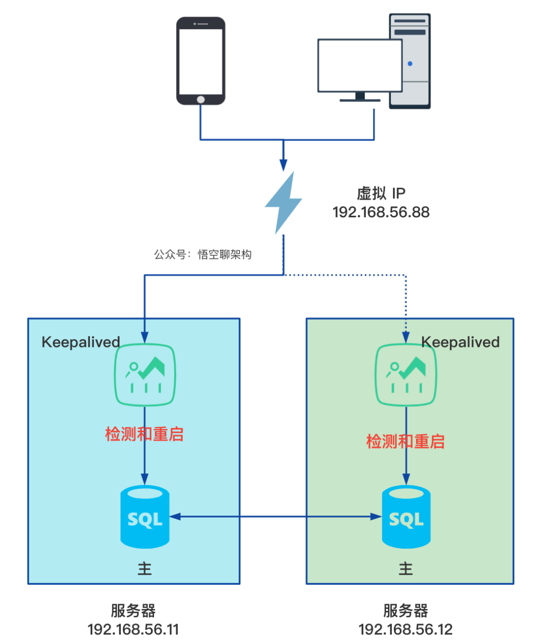 检测和重启:两台服务器上都部署 keepalived 软件,定时检测 MySQL 服务是否正常,如果一个数据库服务崩了,keepalived 会用脚本尝试重启 mysql 服务。 -
