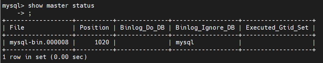 记住 File 和 Position,后面会用到。这里 File = mysql-bin.000008,Position = 1020。