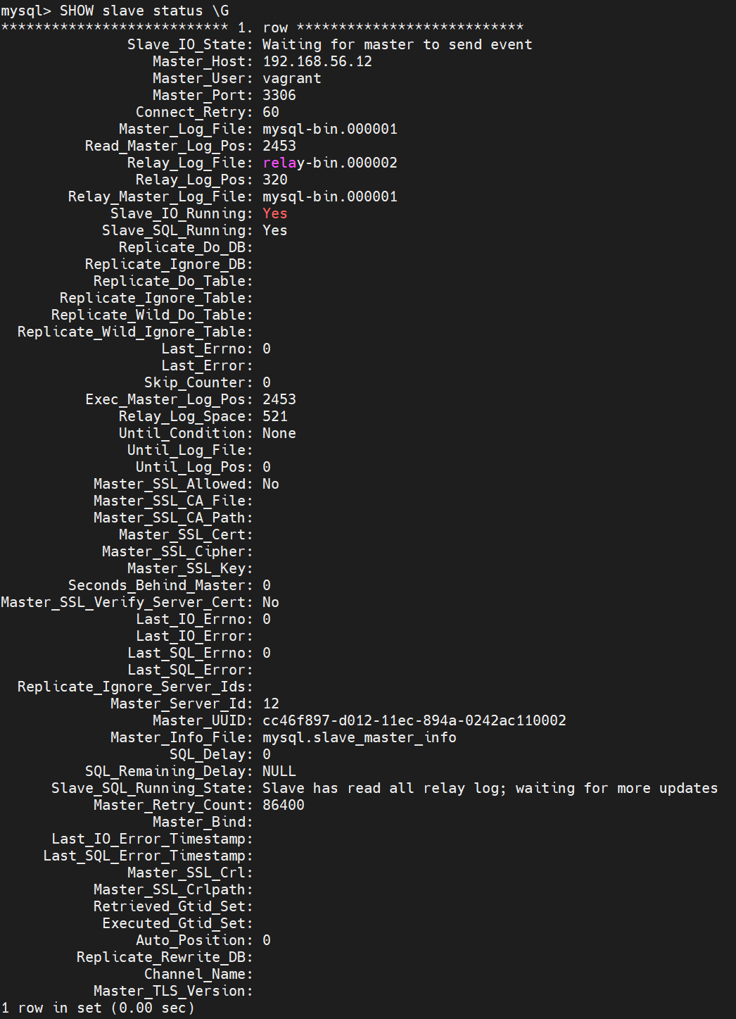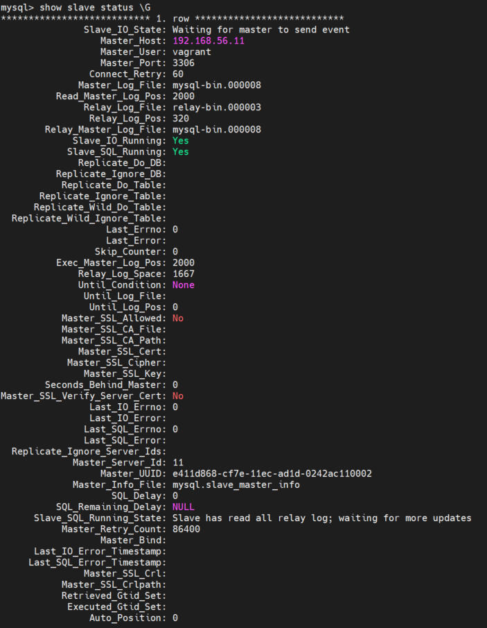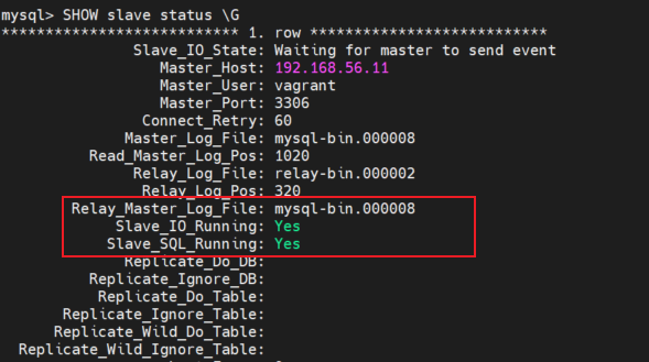 GRANT REPLICATION SLAVE ON *.* TO 'vagrant'@'192.168.56.12';