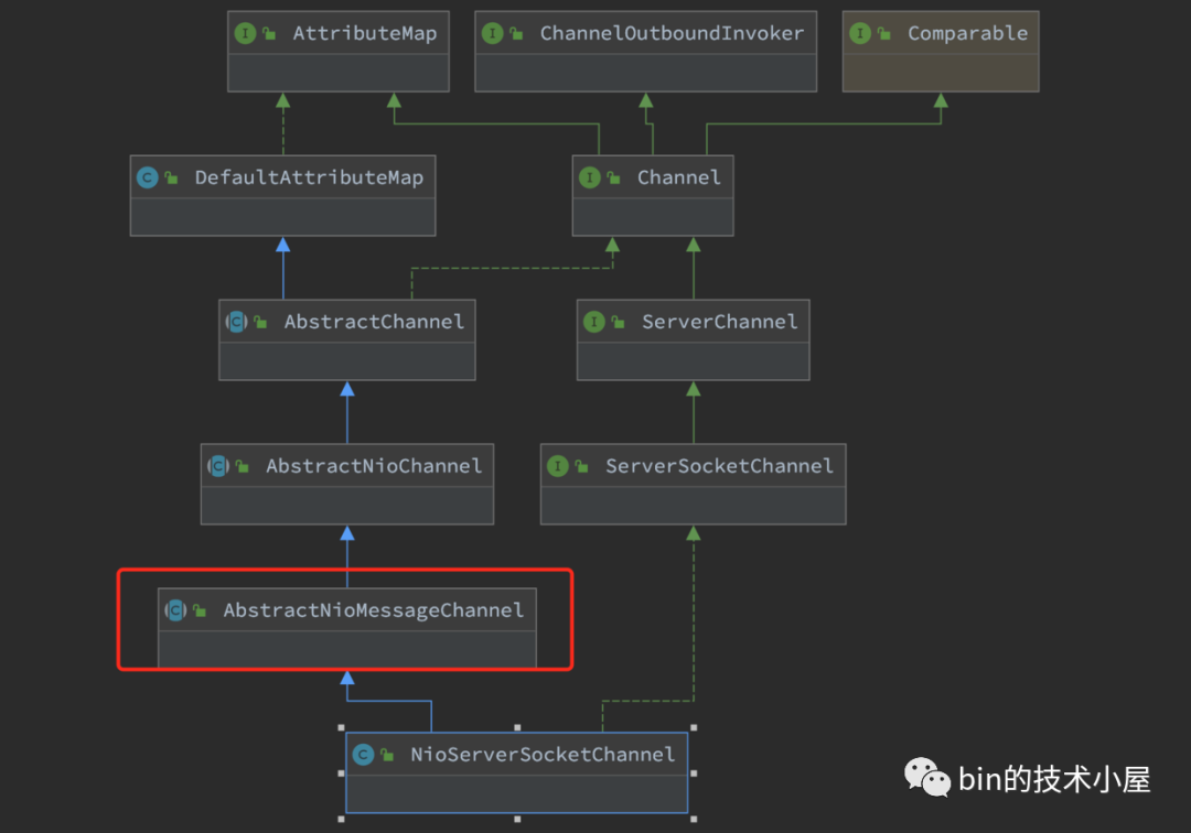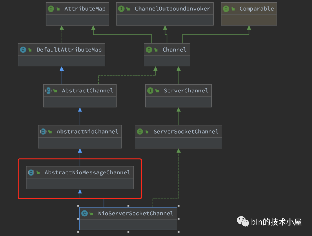 而NioServerSocketChannel中的Unsafe操作类实现类型为NioMessageUnsafe定义在上图继承结构中的AbstractNioMessageChannel父类中。