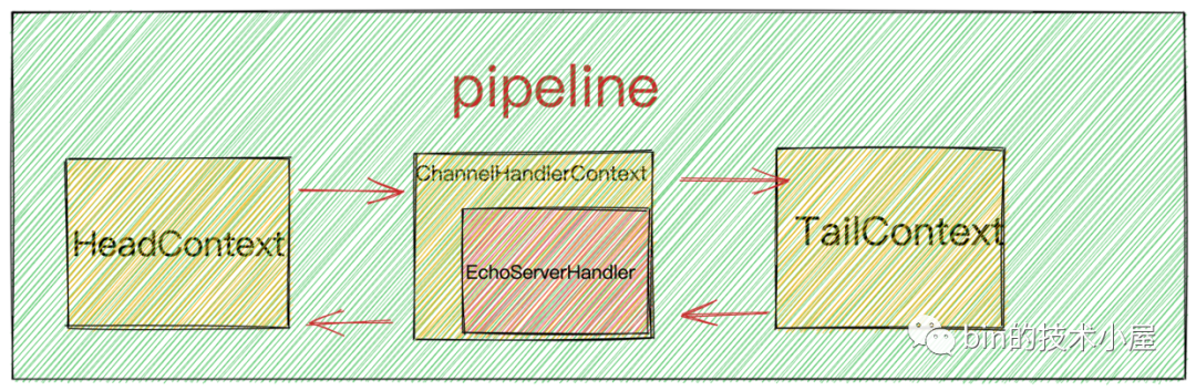此时客户端NioSocketChannel中的pipeline中的结构就变为了我们自定义的样子,在示例代码中我们自定义的ChannelHandler为EchoServerHandler。