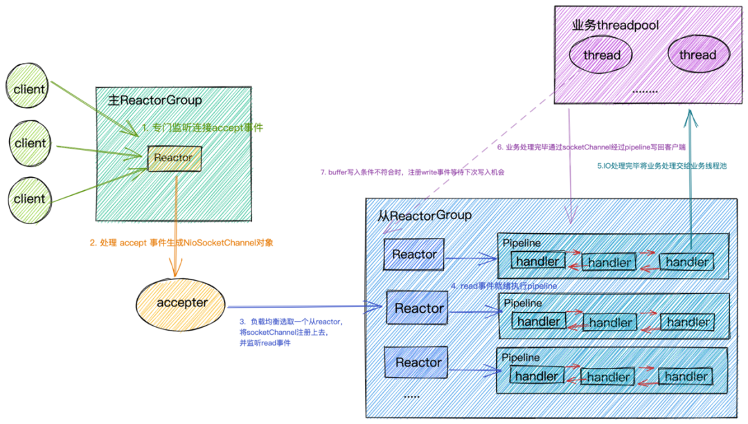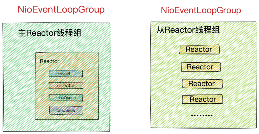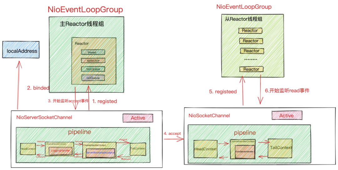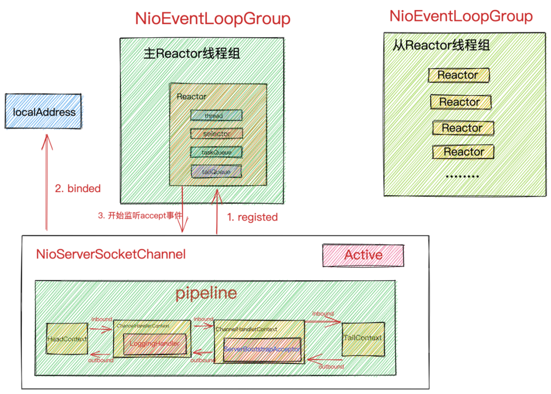 后续我们又围绕着Netty的主从Reactor网络IO线程模型,在?《Reactor模型在Netty中的实现》一文中详细阐述了Netty的主从Reactor模型的创建,以及介绍了Reactor模型的关键组件。搭建了Netty的核心骨架如下图所示: