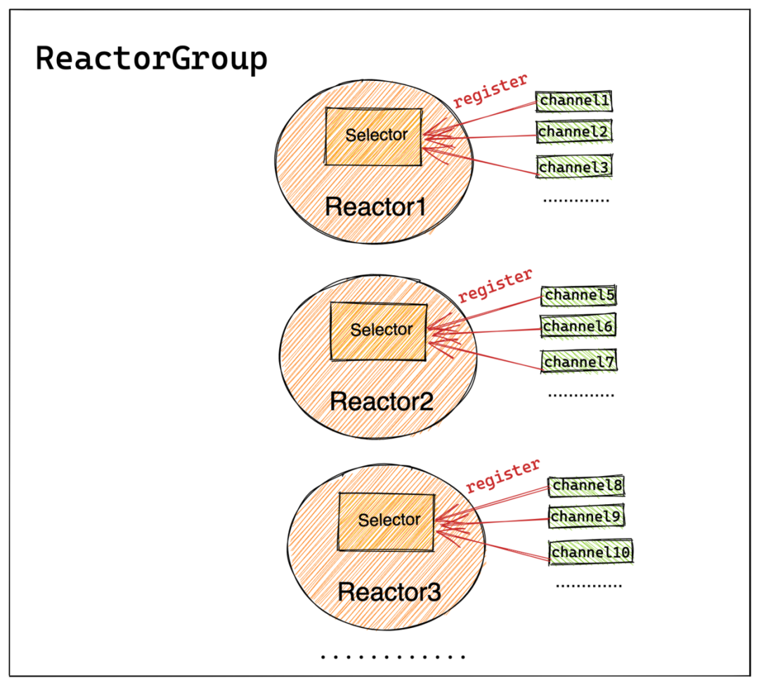 其中一个Channel只能分配给一个固定的Reactor。一个Reactor负责处理多个Channel上的IO就绪事件,Reactor与Channel之间的对应关系如下图所示: