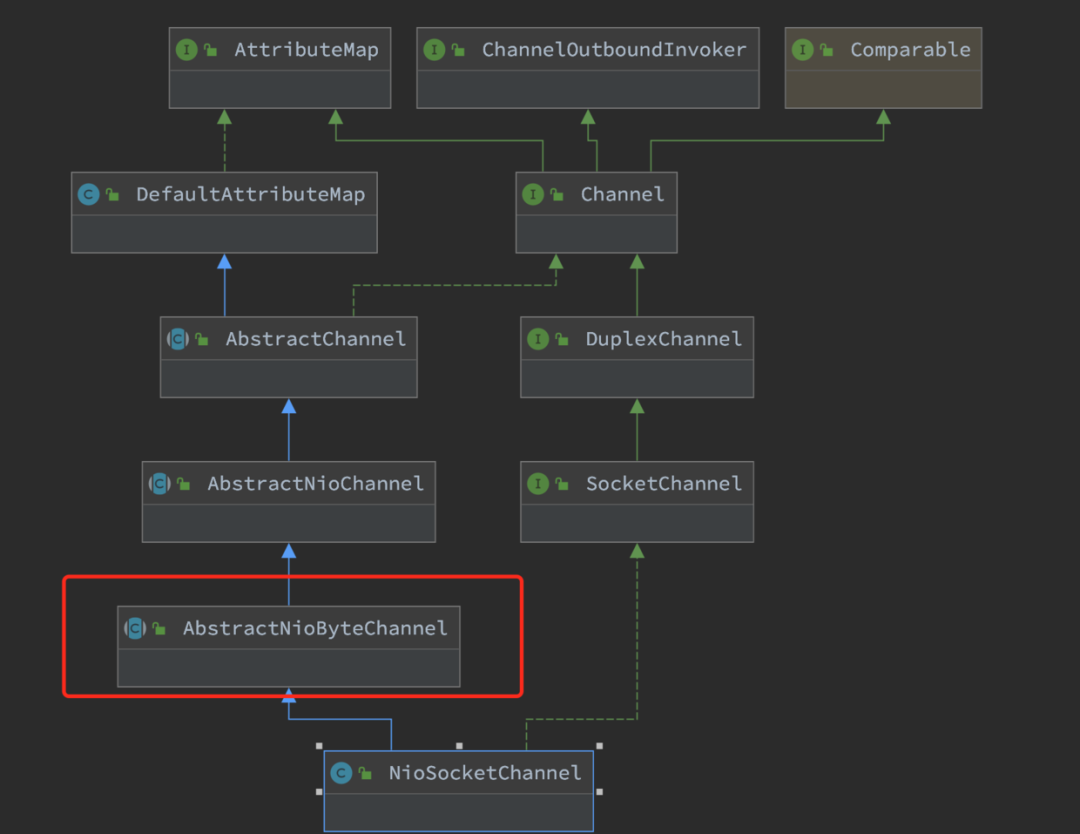 开头通过ch.unsafe()获取到的NioUnsafe操作类正是NioSocketChannel中对底层JDK NIO SocketChannel的Unsafe底层操作类。实现类型为NioByteUnsafe定义在下图继承结构中的AbstractNioByteChannel父类中。