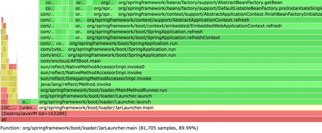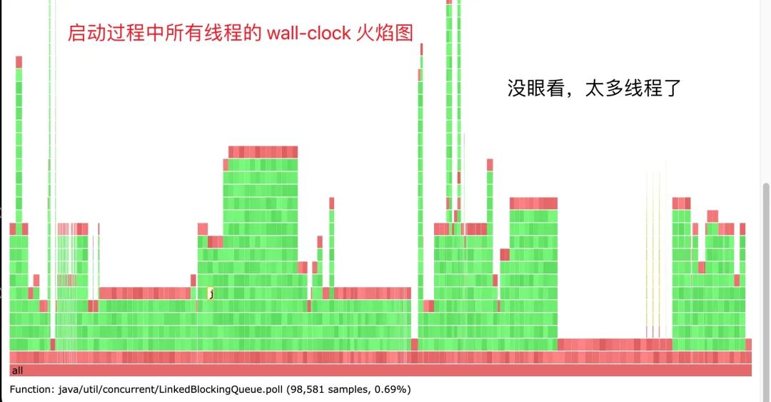 async-profiler 除了可以生成热点调用的火焰图,它还提供了 Wall-clock profiling 的功能,这个功能其实就是固定时间采样所有的线程(不管线程当前是 Running、Sleeping 还是 Blocked),它在文档中也提到了,这种方式的 profiling 适合用来分析应用的启动过程,我们姑且用这个不太精确的方式来粗略测量启动阶段耗时在了哪些函数里。