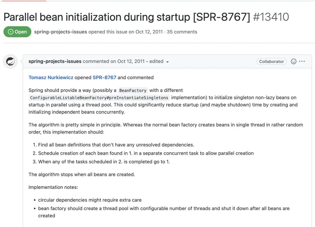 更好一点的方案是基于 SpringBean 的依赖关系做并行加载。这个特性 2011 年前就有人提给了 Spring,具体看这个 issue:https://github.com/spring-projects/spring-framework/issues/13410