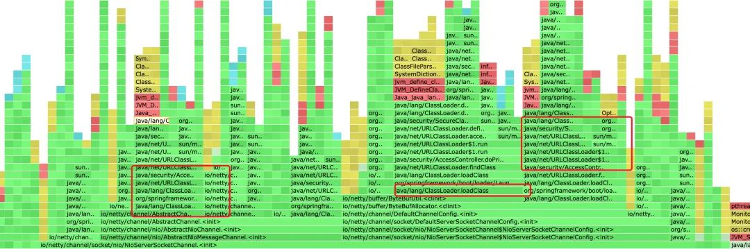 接下来就是分析这个 wall-clock 的火焰图,点开几个调用栈仔细分析,发现很多时间花费在类和资源文件查找和加载(挺失望的,java 连这部分都做不好)
