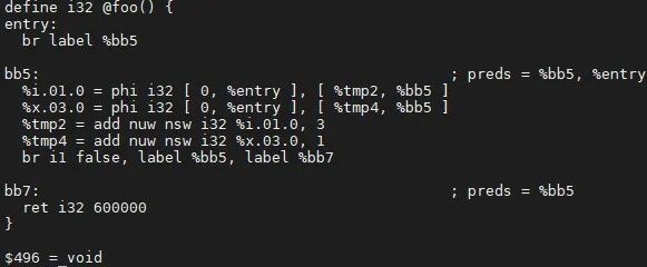 例子中, %tmp4 和phi结点 %x.03.0 构成了一个不会有成果的循环,就会删除它们,同理删除 %tmp2 和 %i.01.0 。优化结果如下: