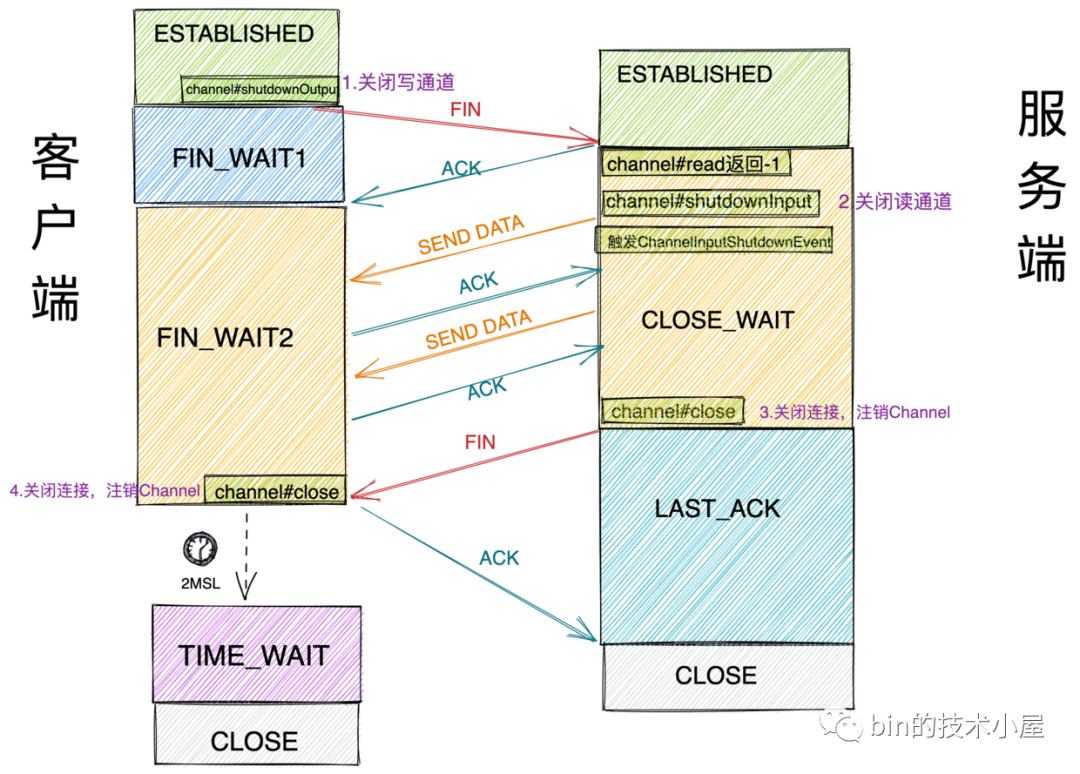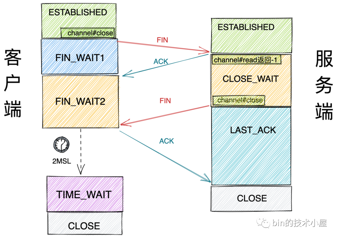 首先 Netty 客户端在对应的 ChannelHandler 中调用 ctx.channel().close() 方法主动关闭连接,内核会向服务端发送一个 FIN 包,随即客户端连接进入 FIN_WAIT1 状态。