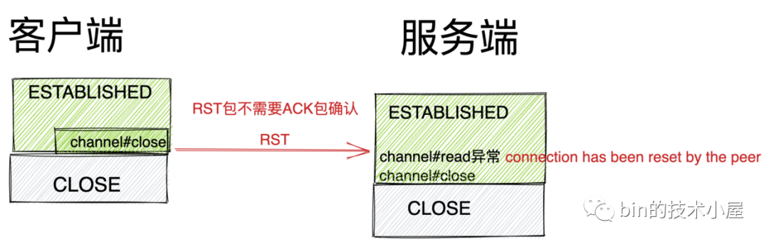 由于客户端调用的是 ctx.channel().close() 方法来关闭连接,相当于将 TCP 连接的读写通道同时关闭,所以客户端在 FIN_WAIT2 状态下无法在接收服务端发送的数据,但此时服务端处于 CLOSE_WAIT 状态下仍可向客户端发送数据,只不过客户端在接收到数据后会丢弃并发送 RST 报文给服务端。