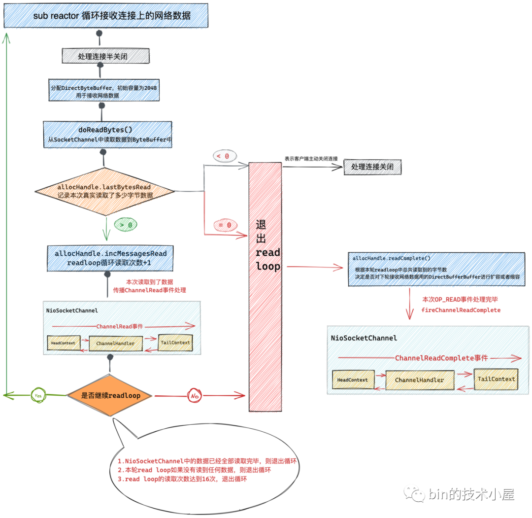 因为半关闭的状态下,在没有调用 close 方法关闭 Channel 之前,JDK NIO Selector 会一直不停的通知 OP_READ 事件,所以流程马上又会回到 OP_READ 事件的处理方法中。