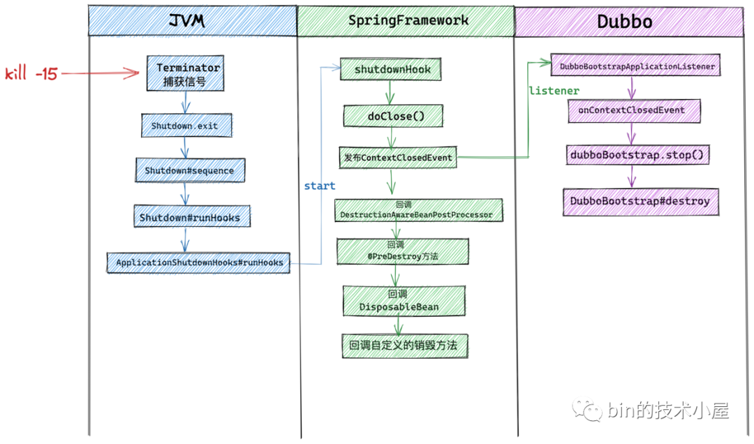 随后我们会从 JVM 层一路奔袭到 Spring 然后到 Dubbo。在这个过程中,笔者还会带大家一起 Shooting Dubbo 在优雅停机下的一个 Bug,并为大家详细介绍修复过程。