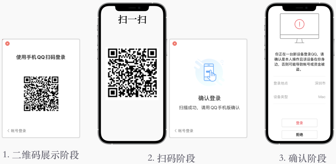 先看 QQ 扫描登录的流程,大致分为三个阶段: