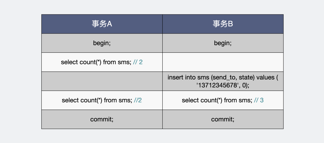 对于两个事务A和B,一开始**s表假设就2条数据,那事务A一开始确实是读到2条数据。事务B在这期间插入了1条数据,按道理数据库其实有3条数据了,但由于可重复读的隔离级别,事务A依然还是只能读到2条数据。