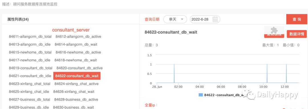 为了方便观察连接池的状态,在服务增加了连接池监控,包含连接数量,活跃数量,空闲数量以及等待连接的数量,监控内容如下图所示: