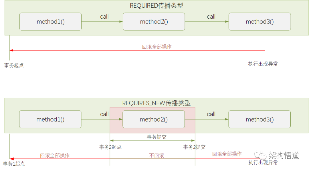 事务的传播行为,将会影响到事务控制的结果,比如最终是在同一事务中,一旦遇到异常,所有操作都会被回滚掉,而如果是在多个事务中,则某一个事务的回滚,不影响已提交的其余事务的回滚。