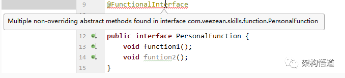 我们自己定义一个函数式接口,里面提供两个抽象方法测试一下,会发现IDEA中直接就提示编译失败了: