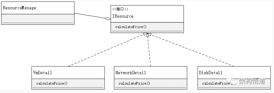 那按照常规的思路,我们要将定制逻辑从公共逻辑中剥离,会定义一个接口类型,要求不同资源实体类都继承此接口类,实现接口类中的calculatePirce方法,这样在平台通用计算逻辑的时候,就可以通过泛型接口调用的方式来实现我们的目的: