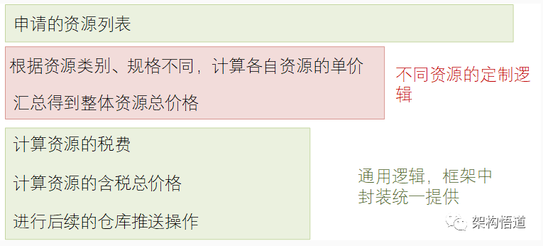 因为我们要做的是一个通用框架逻辑,且申请的资源类型很多,所以我们显然不可能直接在平台框架代码里面通过if else的方式来判断类型并在框架逻辑里面去写每个不同资源的计算逻辑。