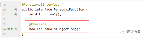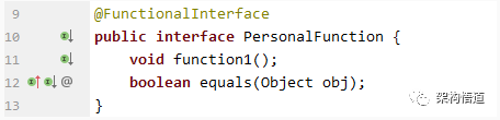 同样是这个自定义的函数式接口,我们修改下里面的抽象方法名称,改为 equals方法,会发现这样就不报错了: