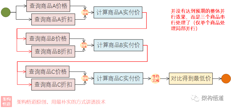 这3个步骤中,第1、2两个耗时操作也是相对独立的,如果也能并行处理的话,响应时长上应该又会缩短一些,即如下的处理流程: