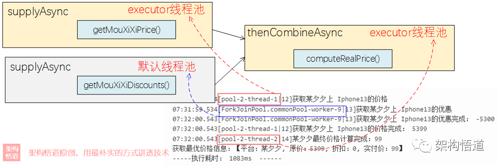 执行结果如下,可以看到执行线程名称与用法1示例相比发生了变化。因为没有指定线程池,所以两个supplyAsync方法都是用的默认的ForkJoinPool线程池,而thenCombine使用的是上一个任务所使用的线程池,所以也是用的ForkJoinPool。