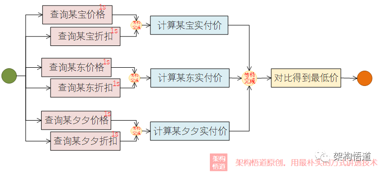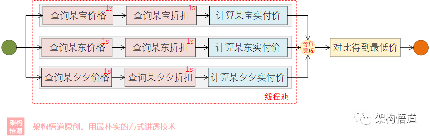 上述代码中,将三个不同平台对应的Callable函数逻辑放入到ThreadPool中去执行,返回Future对象,然后再逐个通过Future.get()接口阻塞获取各自平台的结果,最后经比较处理后返回最低价信息。