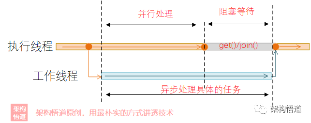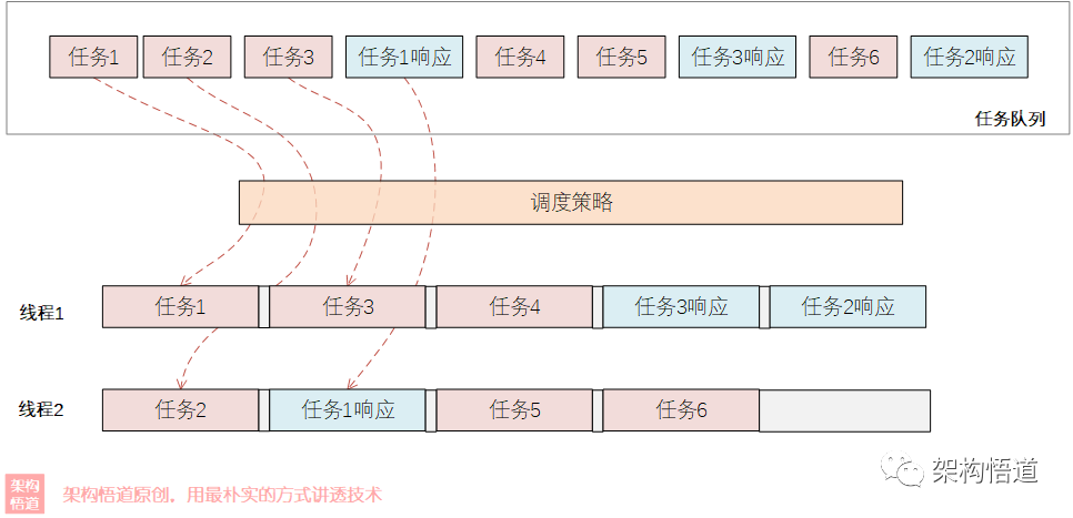 基于异步编程实现的并行操作也是借助线程池的方式,通过多线程同时执行来实现效率提升的。与并发的区别在于:并行通过将任务切分为一个个可独立处理的小任务块,然后基于系统调度策略,将需要执行的任务块分配给空闲可用工作线程去处理,如果出现需要等待的场景(比如IO请求)则工作线程会将此任务先放下,继续处理后续的任务,等之前的任务IO请求好了之后,系统重新分配可用的工作线程来处理。