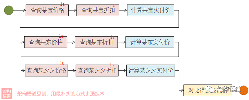 但实际上,每个平台之间的操作是互不干扰的,那我们自然而然的可以想到,可以通过多线程的方式,同时去分别执行各个平台的逻辑处理,最后将各个平台的结果汇总到一起比对得到最低价格。