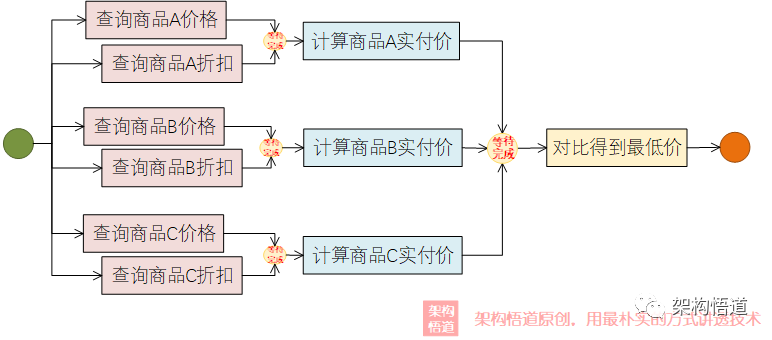 // 等待所有线程结果都处理完成,然后从结果中计算出最低价