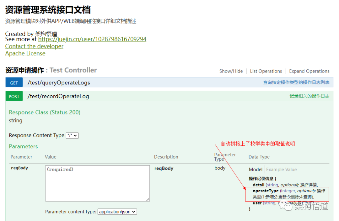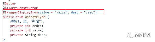 上面示例代码中,OperateType是一个已经定义好的枚举类。现在又遇到一个问题,枚举类的实现形式其实也不一样,要如何才能让我们的自动内容生成服务知道获取枚举类中的哪些内容进行处理呢?当然我们可以约定用于Swagger注解中的枚举类必须遵循某个固定的格式,但显然这样实施的难度就会提升,并非是我们想要的结果。